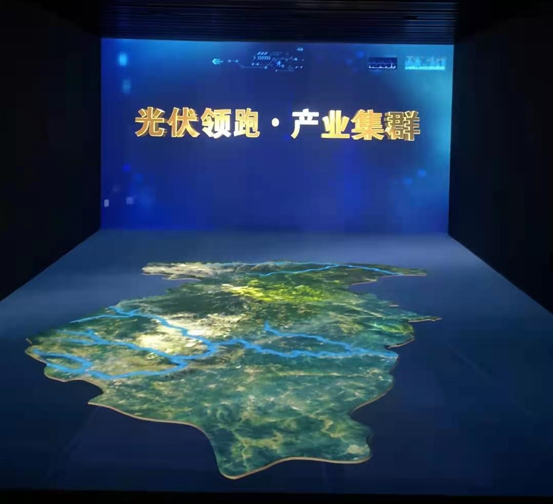 該區(qū)域?yàn)?2臺(tái)投影機(jī)投射出的L型裸眼3D沙盤,展出了,鐵路和公路交通圖,礦產(chǎn)區(qū)域分布情況;以及“光伏領(lǐng)跑 綠色發(fā)展”主題影片,一同感受陽泉光伏領(lǐng)跑者示范基地一路走來的光輝歷程。
